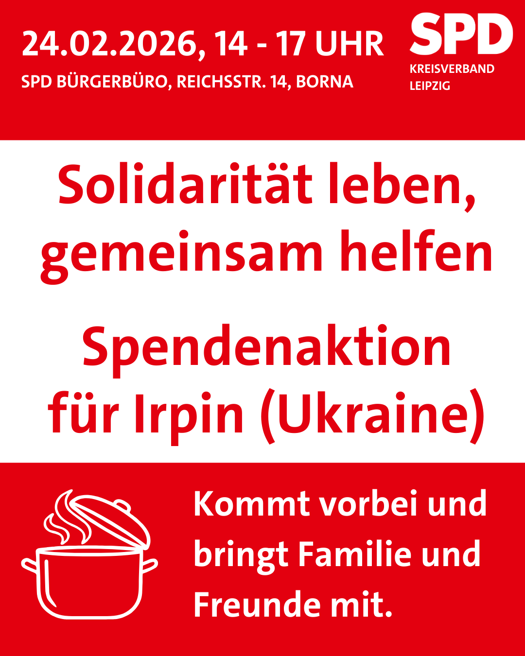 Bei einer Suppe, Kaffee und Kuchen kommen wir miteinander ins Gespräch, sammeln Spenden für die ukrainische Stadt Irpin und zeigen: Solidarität ist kein Schlagwort, sondern gelebte Praxis.